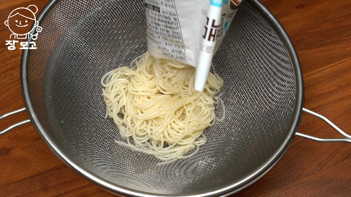 4. 콩 담백면은 채에 받쳐 물기를 빼고 접시에 얹는다 (소면은 100g당 340칼로리, 콩 담백 면은 150g에 30칼로리다)