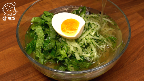 채썬 쌍추와 오이 한 줌, 삶은 계란 고명 얹고 동치미 국물 부어주면 시원한 냉국수가 완성이다