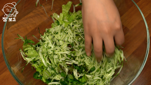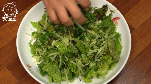 2. 오이 채친 볼에 상추를 가위로 잘게 잘라 넣고, 가볍게 한번 섞는다