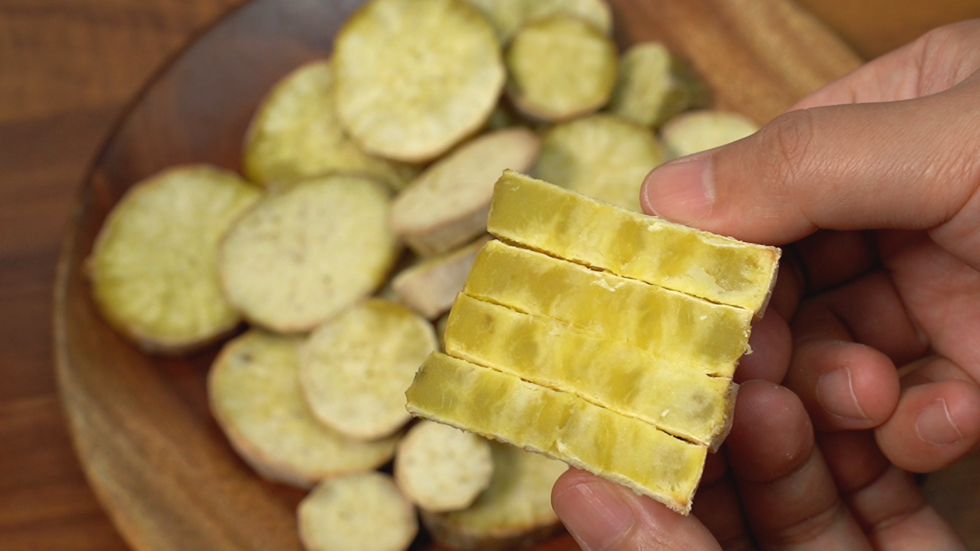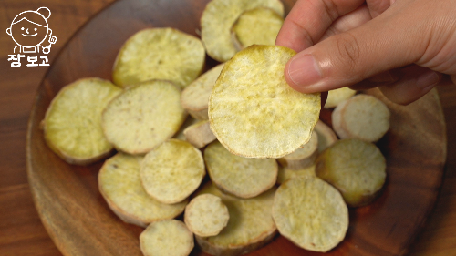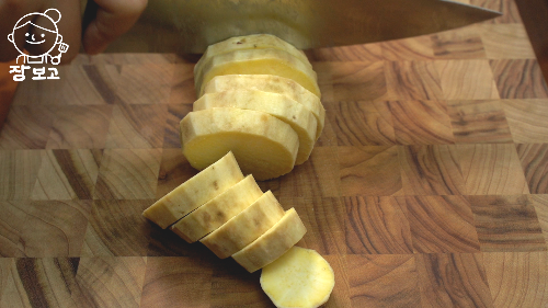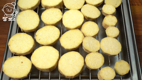 1. 껍질 벗긴 고구마는 1cm 두께로 도톰하게 썰기
