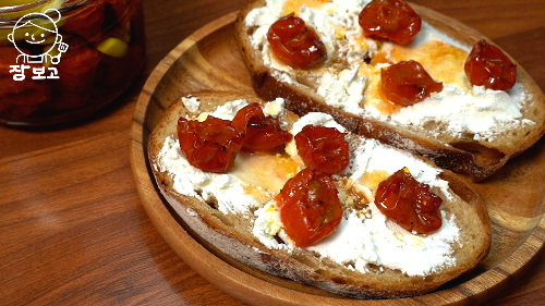 곡물빵에 그릭요거트 바르고 올리브오일에 절여진 토마토 하나씩 올리면 토마토 샌드위치 완성~