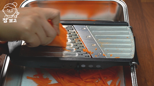 1. 당근은 얇게 채친 뒤 키친타월로 물기를 제거한다. 채치기 전 밧드에 키친타월을 깔고 채치면 편하다.