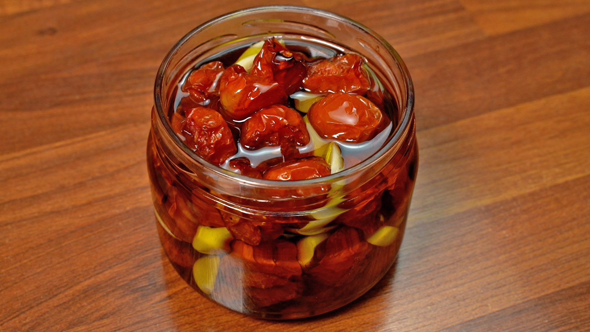 6. 유리병에 편 마늘과 말린 토마토 넣고 올리브오일을 가득 붓는다.