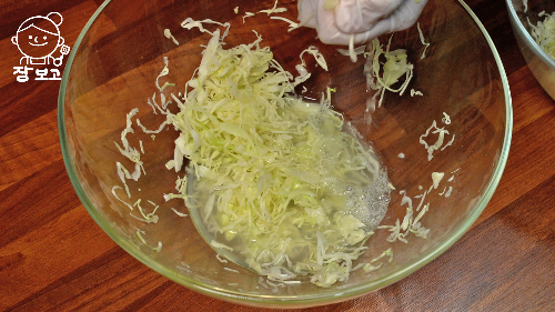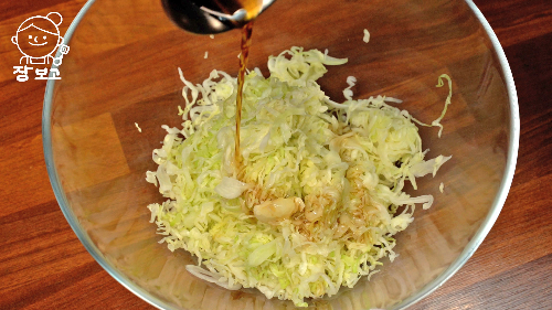 6. 물기 제거한 양배추에 참치액젓 1큰술, 들깻가루 2큰술 넣고 조물조물 무친다