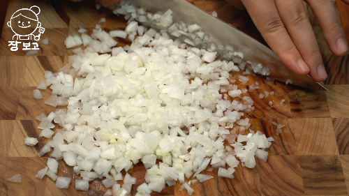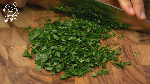 6. 바질 대신 한국 허브인 깻잎 4장 곱게 다지고, 양파 1/2개도 곱게 다져서 소스에 넣고 잘 섞는다