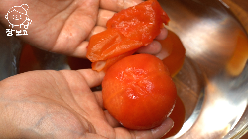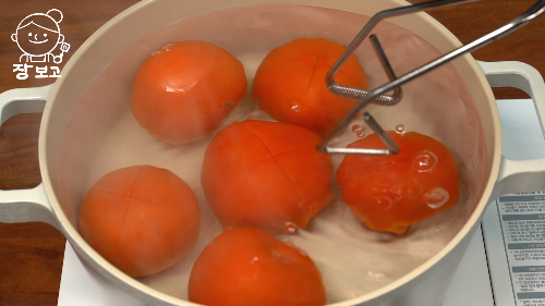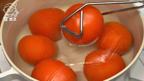 2. 토마토가 잠길 정도의 넉넉한 물이 끓으면 토마토를 넣고 1분 이상 데친 뒤 껍질이 일어나면 찬물에 담근다