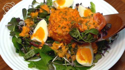 잎 채소 위에 삶은 달걀, 토마토 마리네이드 올리면 비주얼 최고인 토마토 샐러드 완성이다