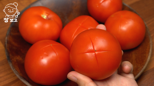 1. 세척 후 꼭지 제거한 토마토에 십자 칼집을 낸다