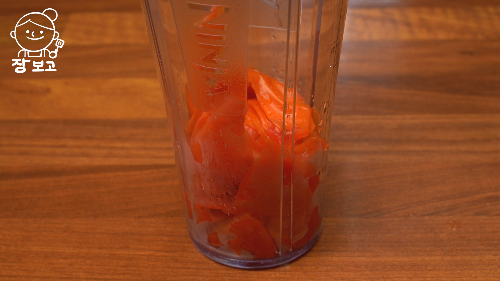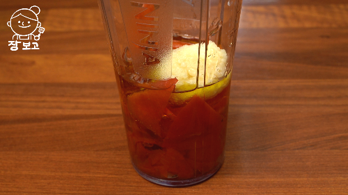 4. 믹서기에 토마토 껍질을 넣는다. 토마토에 간이 잘 배게 하기위해 껍질을 벗기는데 토마토 껍질에는 영양이 풍부하여 버리지 않는다. 이렇게 먹으면 입에 걸리는 것 없이 영양까지 다 먹을 수 있다