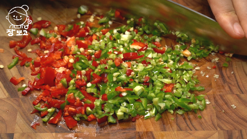 3. 사이에 양파 1/2개 잘게 다지고, 청양고추 2개 홍고추 1개도 곱게 다진다. 매운걸 못 먹는다면 씨를 제거하고 다지면 된다.