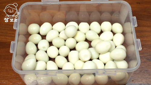 마트에 파는 깐 메추리알 500g 한팩 물에 헹궈 통에 담고, 동일한 양의 양념간장 부으면 양이 딱 맞아떨어진다.