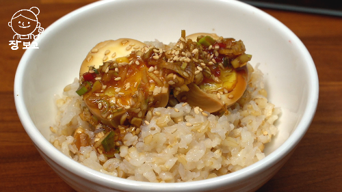 밥 위에 계란장과 참기름 약간 통깨 솔솔 뿌려서 비벼 먹으면 간장 계란밥 완성
