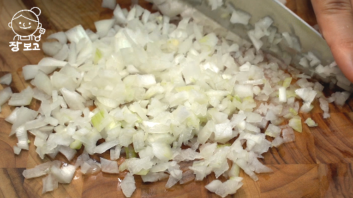 3. 사이에 양파 1/2개 잘게 다지고, 청양고추 2개 홍고추 1개도 곱게 다진다. 매운걸 못 먹는다면 씨를 제거하고 다지면 된다.