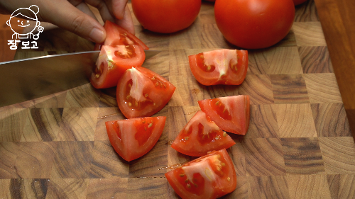 1. 토마토는 믹서기에 갈기 좋은 크기로 썬다. 토마토 껍질에 영양이 많기에 껍질은 벗기지 않고 그대로 사용한다