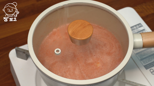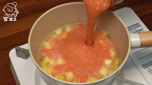 감자가 부드럽게 익으면 냉장 보관했던 토마토 수프를 넣고 뚜껑 덮어 2분만 기다린다
