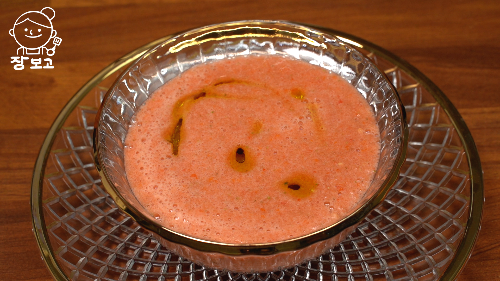 먹기 좋게 그릇에 부어 엑스트라 버진 올리브오일 약간 넣어 잘 섞으면 흡수율 높은 토마토 가스파초 완성!