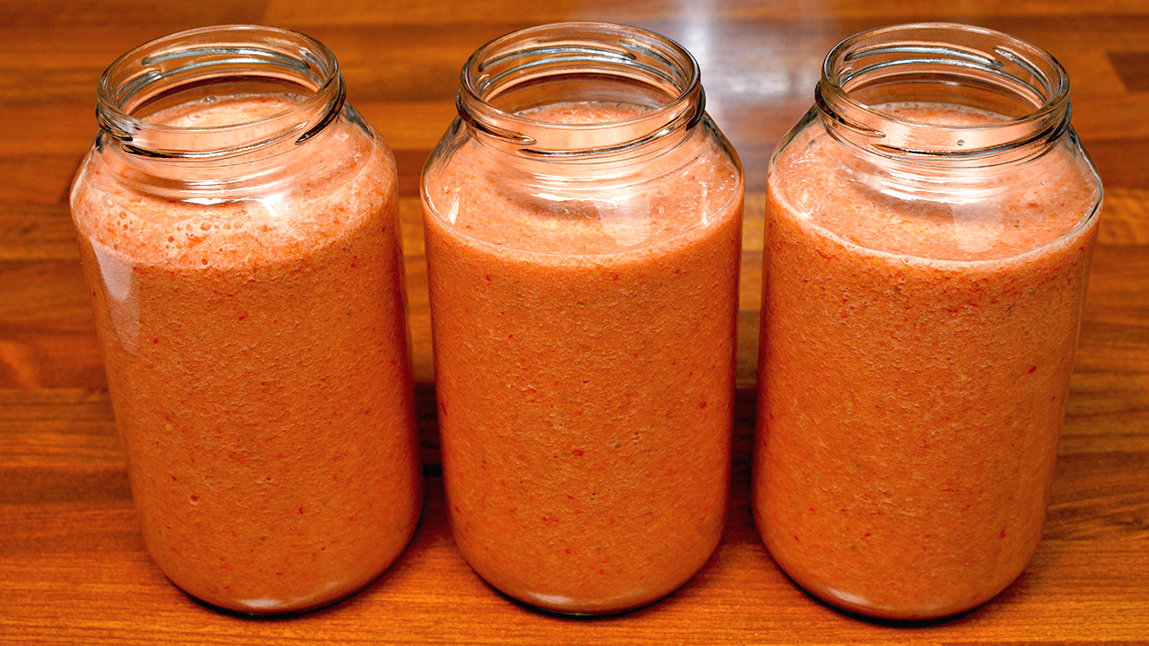 5. 이렇게 만든 가스파초는 병에 담아 냉장보관했다가 바쁜 아침이나 수분 보충이 필요할 때 꺼내먹는다