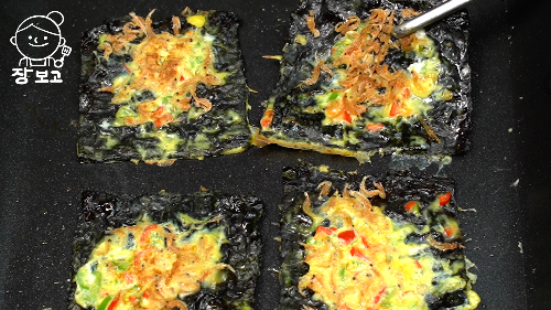 4. 두장씩 겹친 김을 계란물에 푹 담그고 오일 둘러 약불로 예열한 팬에 올린다