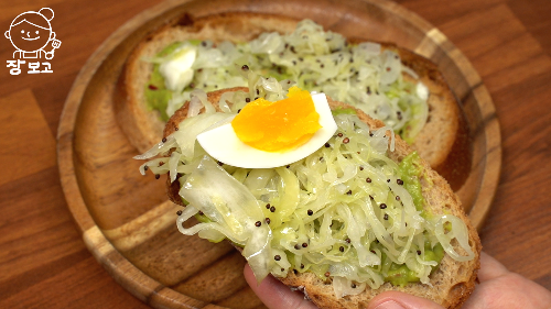 밥 생각이 없을 때는, 잡곡빵에 아보카도 퓌레 바르고 양배추 양파무침 올려 먹어도 잘 어울린다~^^
