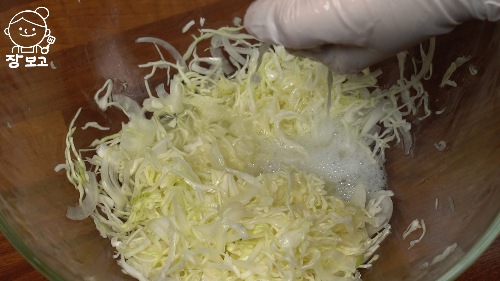 2. 채친 양배추와 양파에 소금 2/3큰술을 넣고 잘 버무려 10분간 절인다