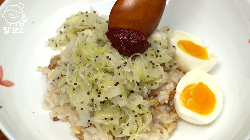 접시에 양배추 양파무침 부어주고, 삶은 계란 1개 곁들여 샐러드처럼 먹는다