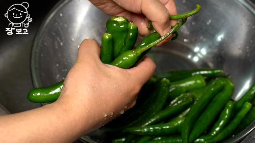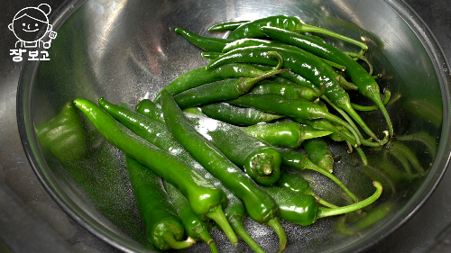 1. 고추는 베이킹소다 1큰술을 넣고 찬물에 10분간 담근다