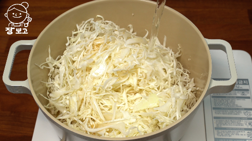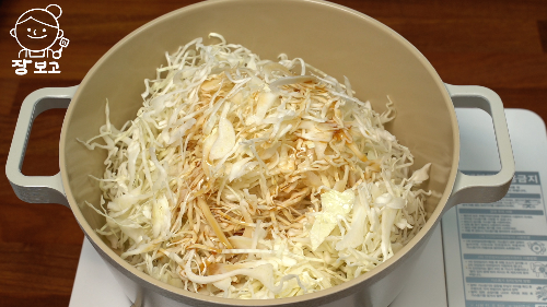 냄비에 얇게 채 썬 양배추와 국간장, 참치액 약간, 물 자박하게 붓고 끓인다.