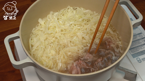양배추 숨이 죽으면 한쪽으로 몰아 얇은 소고기 데친다.