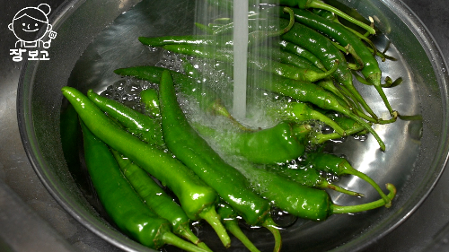 1. 고추는 베이킹소다 1큰술을 넣고 찬물에 10분간 담근다