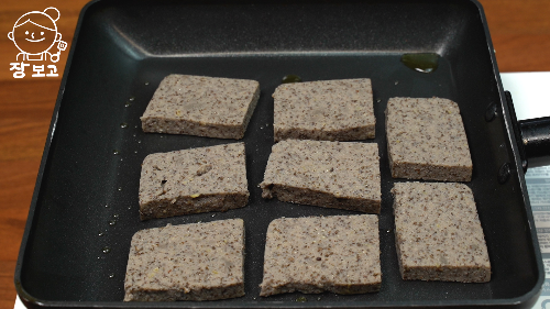 팬에 오일 넉넉히 두르고 콩 묵을 바싹 굽는다. 이렇게 하면 신기하게도 스팸처럼 된다 ㅎㅎ