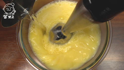계란 풀기도 귀찮을 때는 핸드믹서로 갈아준다. 계란, 소금, 참치액 동일하게 넣고 핸드믹서로 갈며 뜨거운물을 넣어주면 된다.