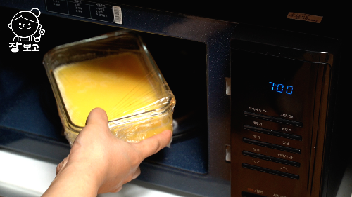 5. 랩을 완전히 덮지 말고 살짝 비스듬히 덮어 전자레인지에 1분씩 끊어가며 총 8분 돌린다. 계란물이 용기의 70% 이상이거나 1000w 전자레인지에서 한 번에 길게 돌리면 순간적으로 온도가 높아져서 끓어 넘칠 수 있으니 꼭 1분씩 끊어 돌린다.