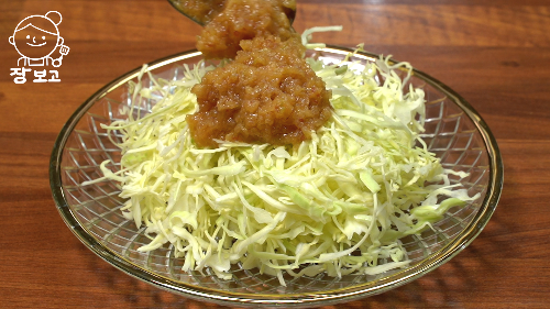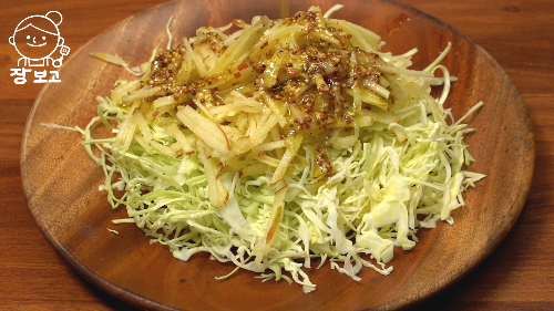 먹기 직전 채 썬 양배추 위에 사과 소스 듬뿍 얹어서 섞어주면 된다