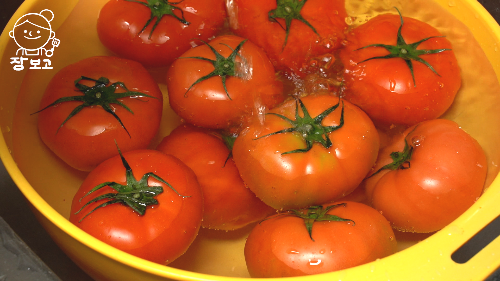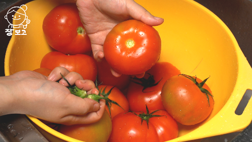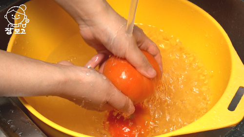 3. 토마토 꼭지를 제거하고 사이를 문질러 깨끗이 세척한다