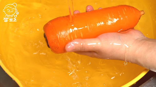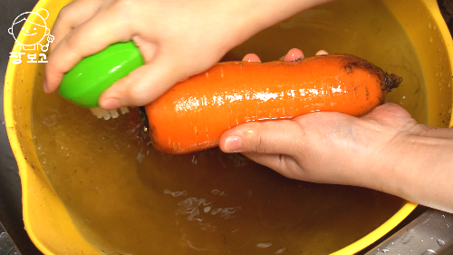 5. 야채솔로 문지르며 닦는다. 당근 껍질에 영양이 많기에 껍질 벗기지 않고 사용한다
