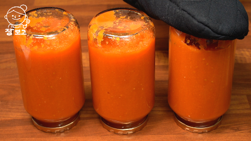 6. 뜨거울 때 바로 열탕소독한 유리병에 80% 정도 채워 넣고 뚜껑을 꼭 닫는다 (느슨하게 닫으면 압력 때문에 열릴 수 있음 주의)