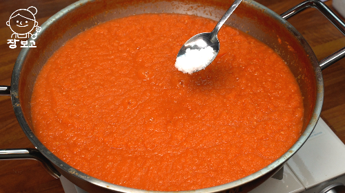 5. 30분 졸인 토마토 당근에 소금 약간 넣고 섞는다