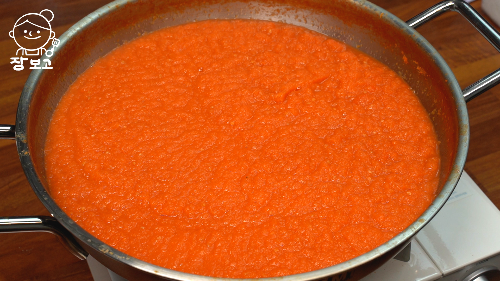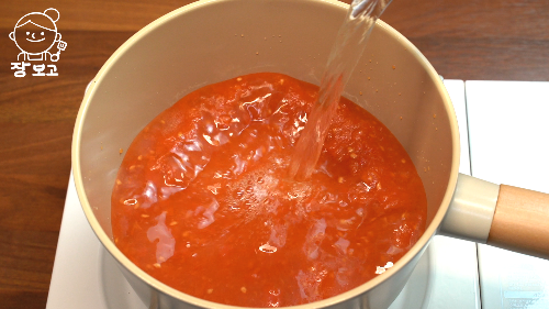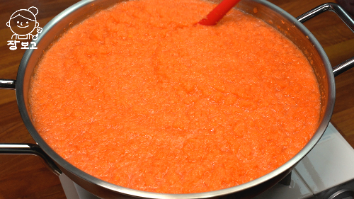 3. 갈아놓은 토마토와 당근을 냄비에 붓고 강불에 끓인다