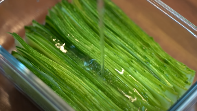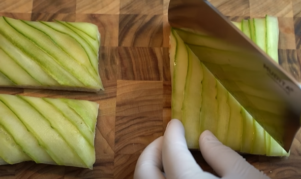 2. 오이 끝에 포크를 꽂아 감자칼로 슬라이스 해서 통에 담는다.