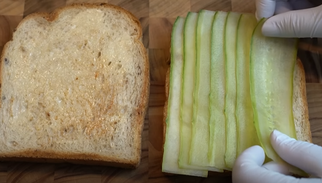 오이 샌드위치 :: 바삭한 통밀빵에 마요네즈 바르고 오이피클을 겹겹이 올린다.