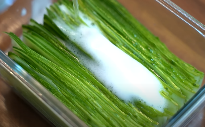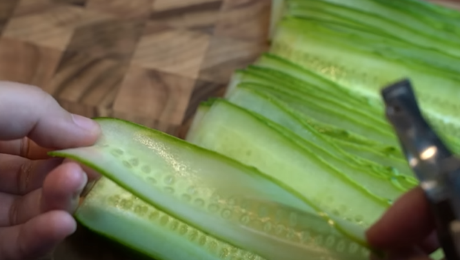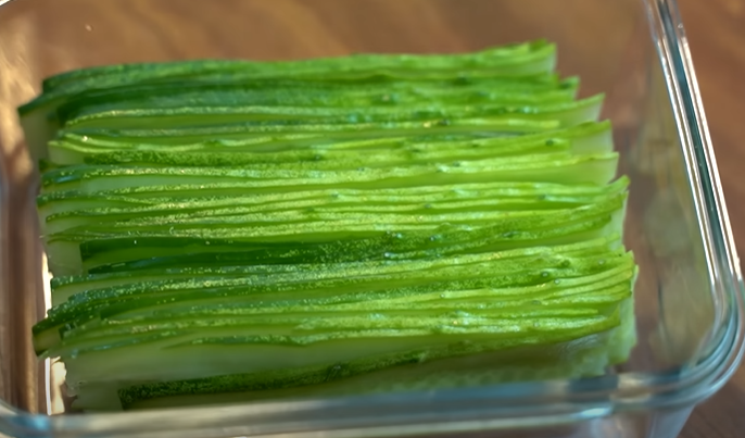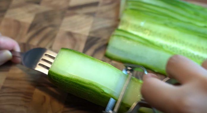 2. 오이 끝에 포크를 꽂아 감자칼로 슬라이스 해서 통에 담는다.