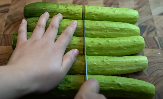 1. 세척한 오이는 양쪽 끝을 자르고 이등분한다.