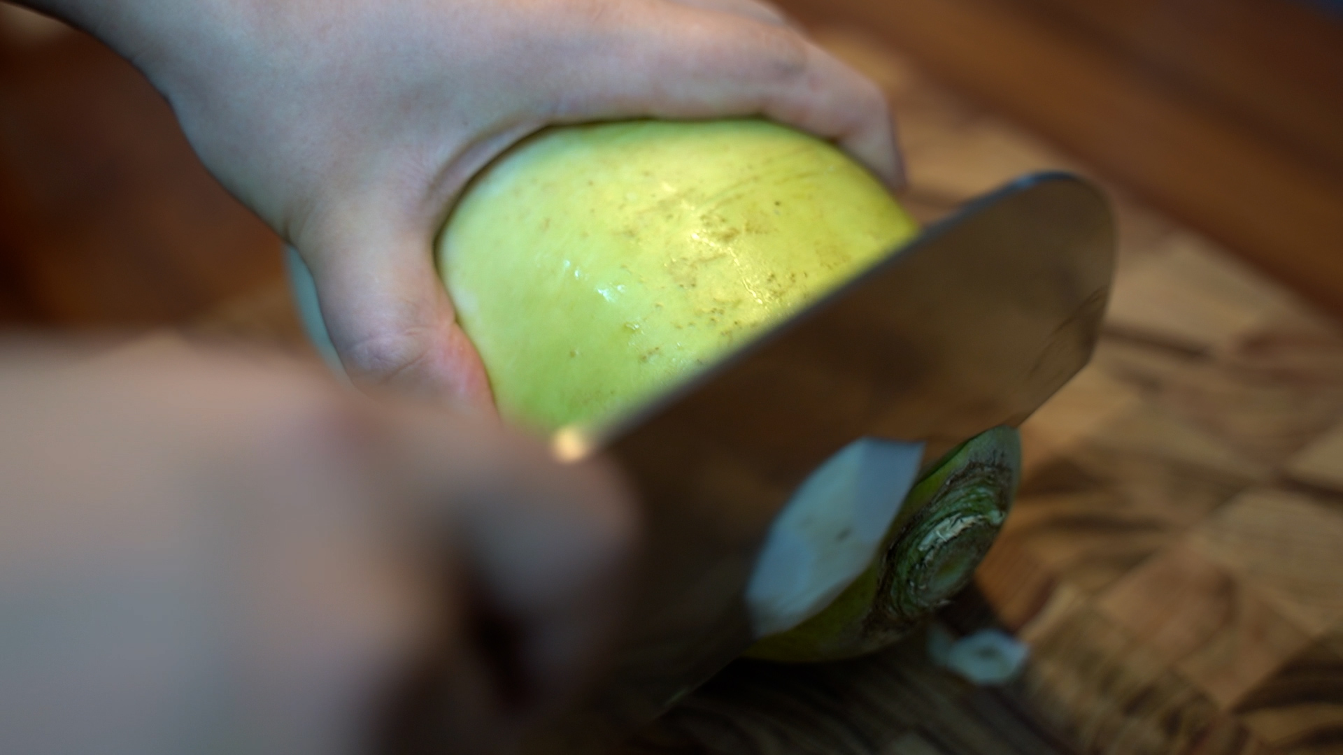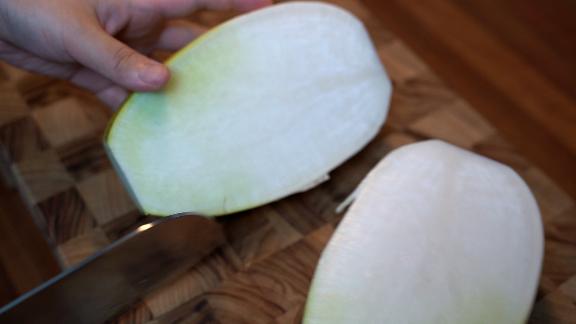2. 양쪽 끝을 정리하고, 길게 반을 잘라 얇게 슬라이스 한다.