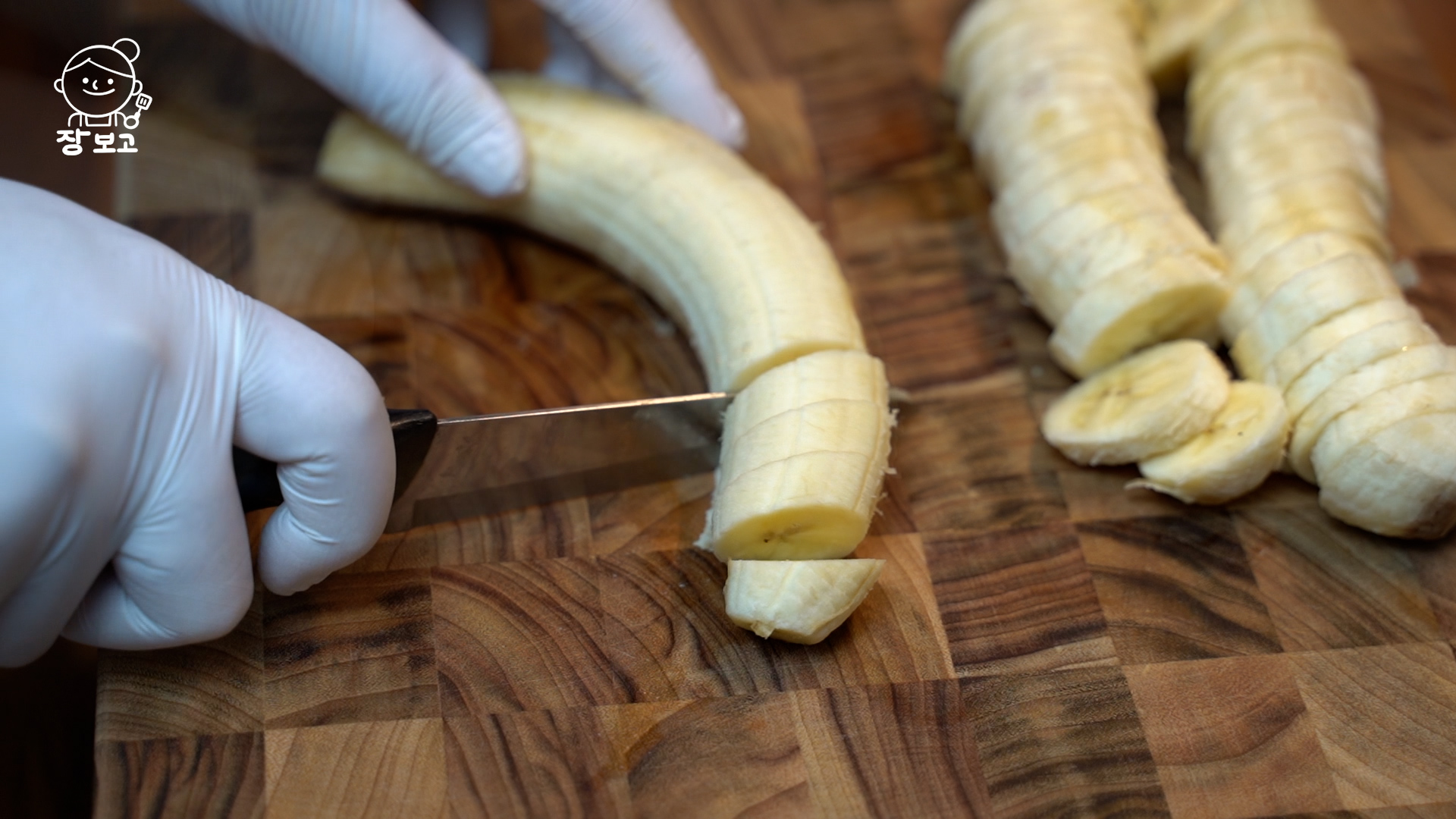 1. 바나나는 양쪽 끝을 날리고 껍질 벗겨 얇게 썰어준다