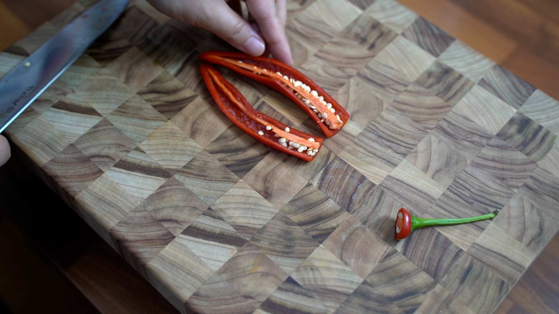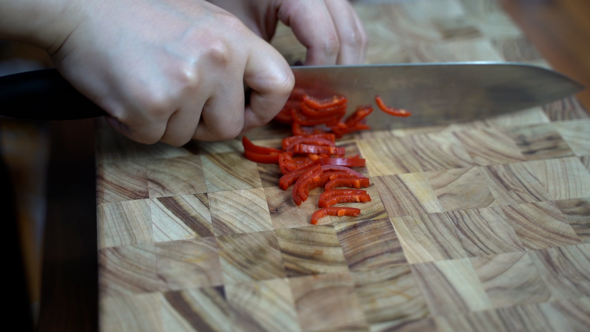 4. 홍고추는 씨를 털어 얇게 썰고, 대파는 흰 부분만 잘게 썬다.