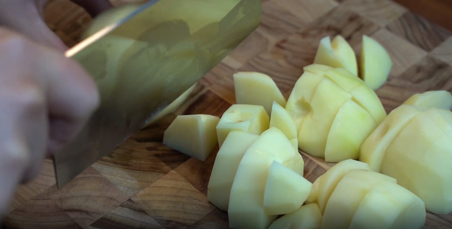 1. 껍질 벗긴 감자 세 개는 반을 잘라 6~8등분 하고 물에 담가 전분기를 뺀다