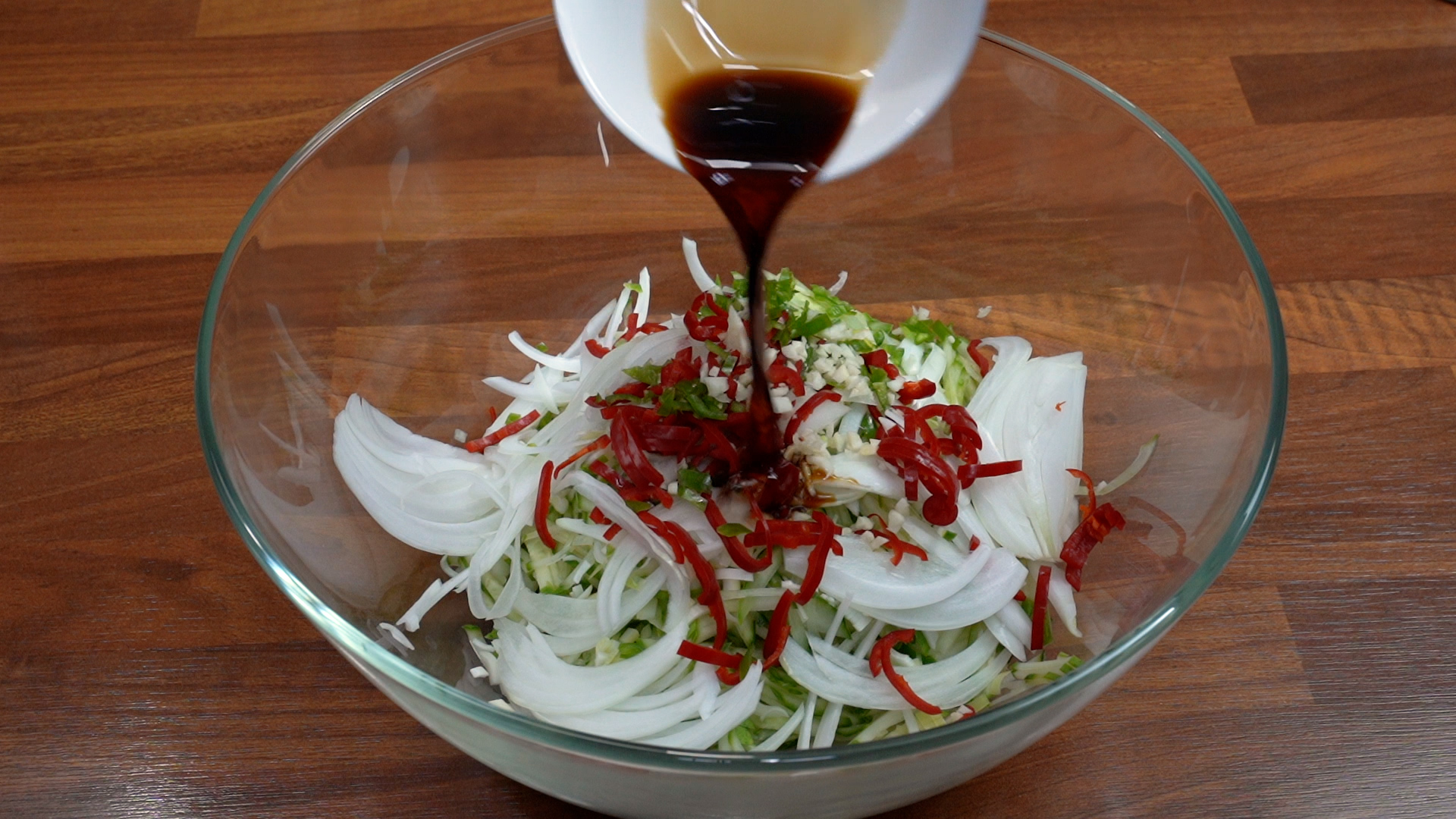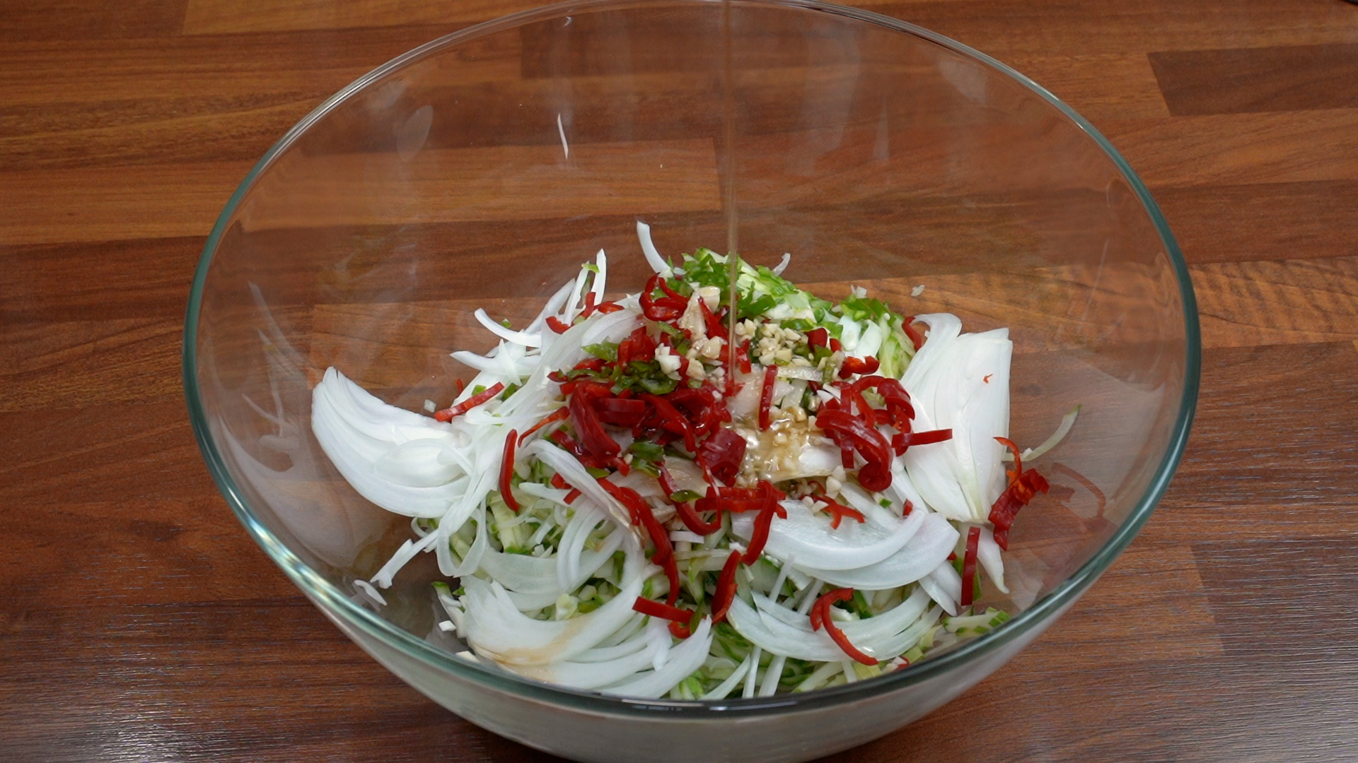 오이, 양파, 홍고추, 깐 마늘, 국간장, 레이지레몬주스, 소면, 유리볼, 네오플램냄비