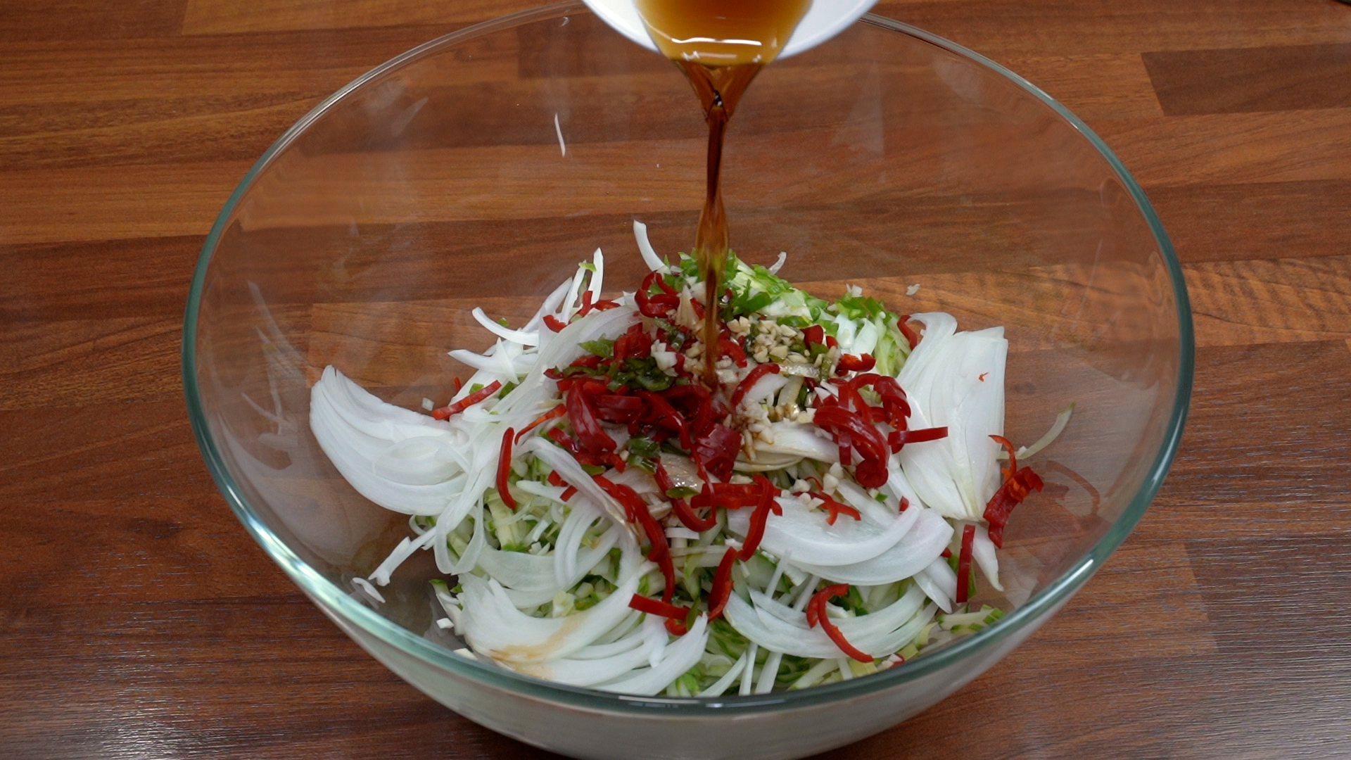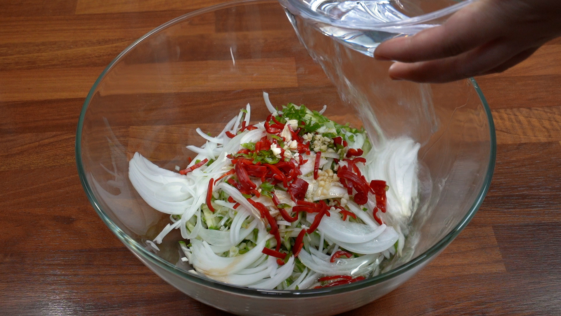오이, 양파, 홍고추, 깐 마늘, 국간장, 레이지레몬주스, 소면, 유리볼, 네오플램냄비