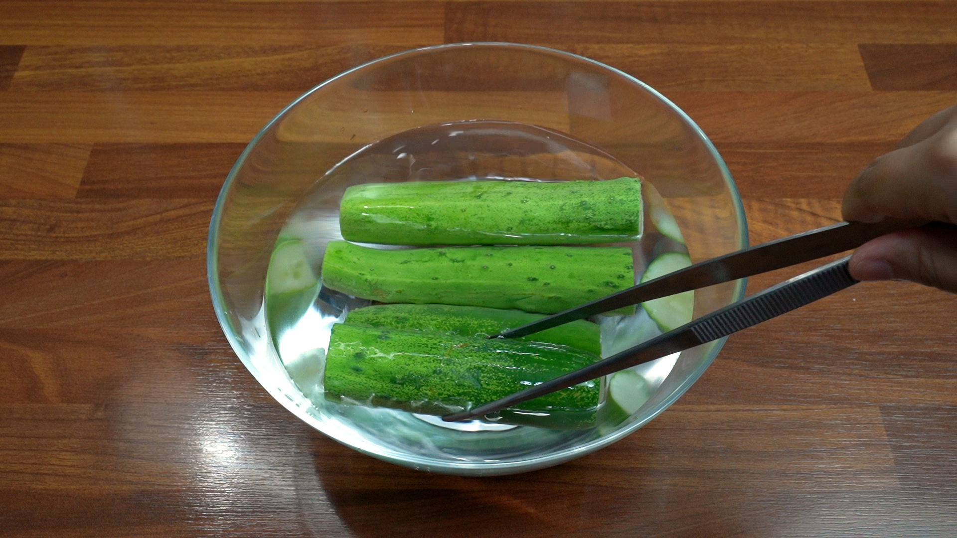 3. 끓인 소금물은 불을 끄고 오이를 넣어 1분간 데친다. (이 과정에서 오이는 아삭함이 살아나고 조직이 더 단단해져 쉽게 무르지 않는다) 데친 오이는 바로 찬물에 넣어 식힌다.