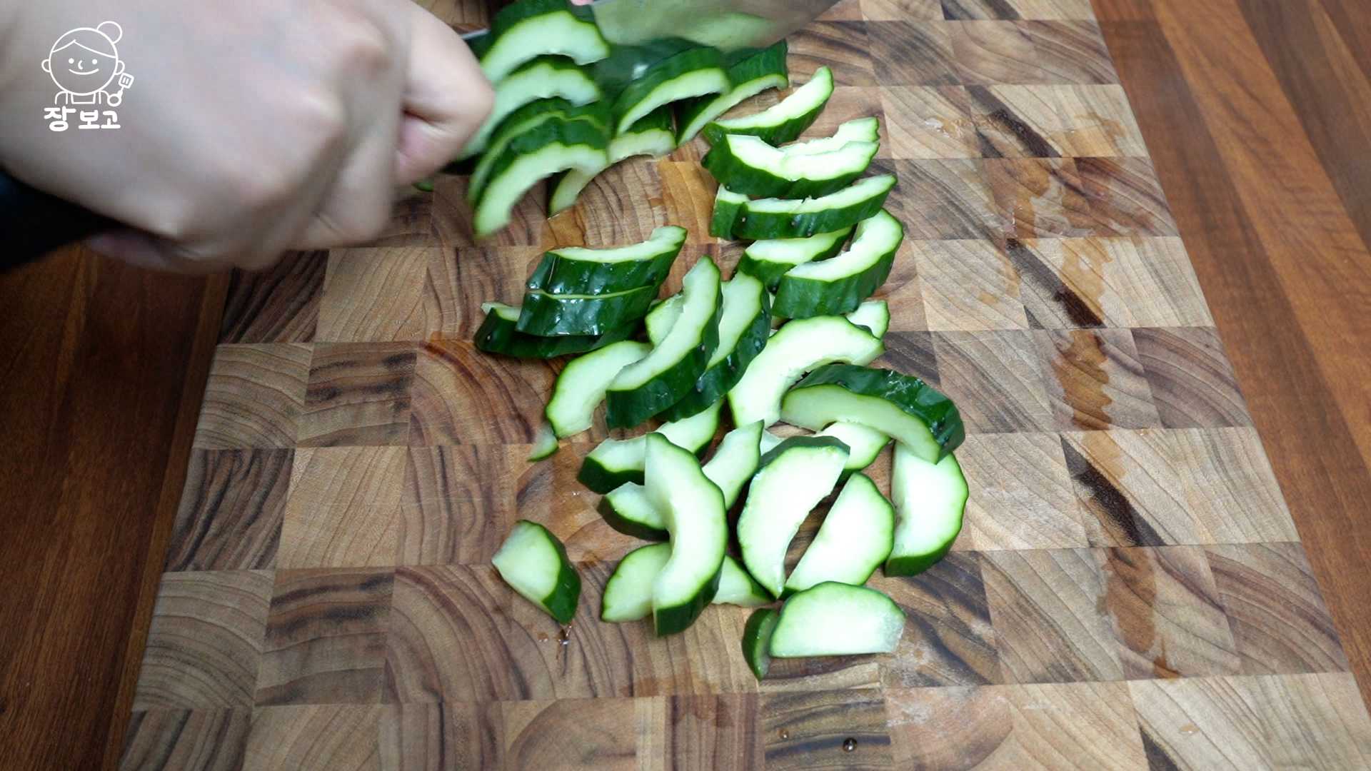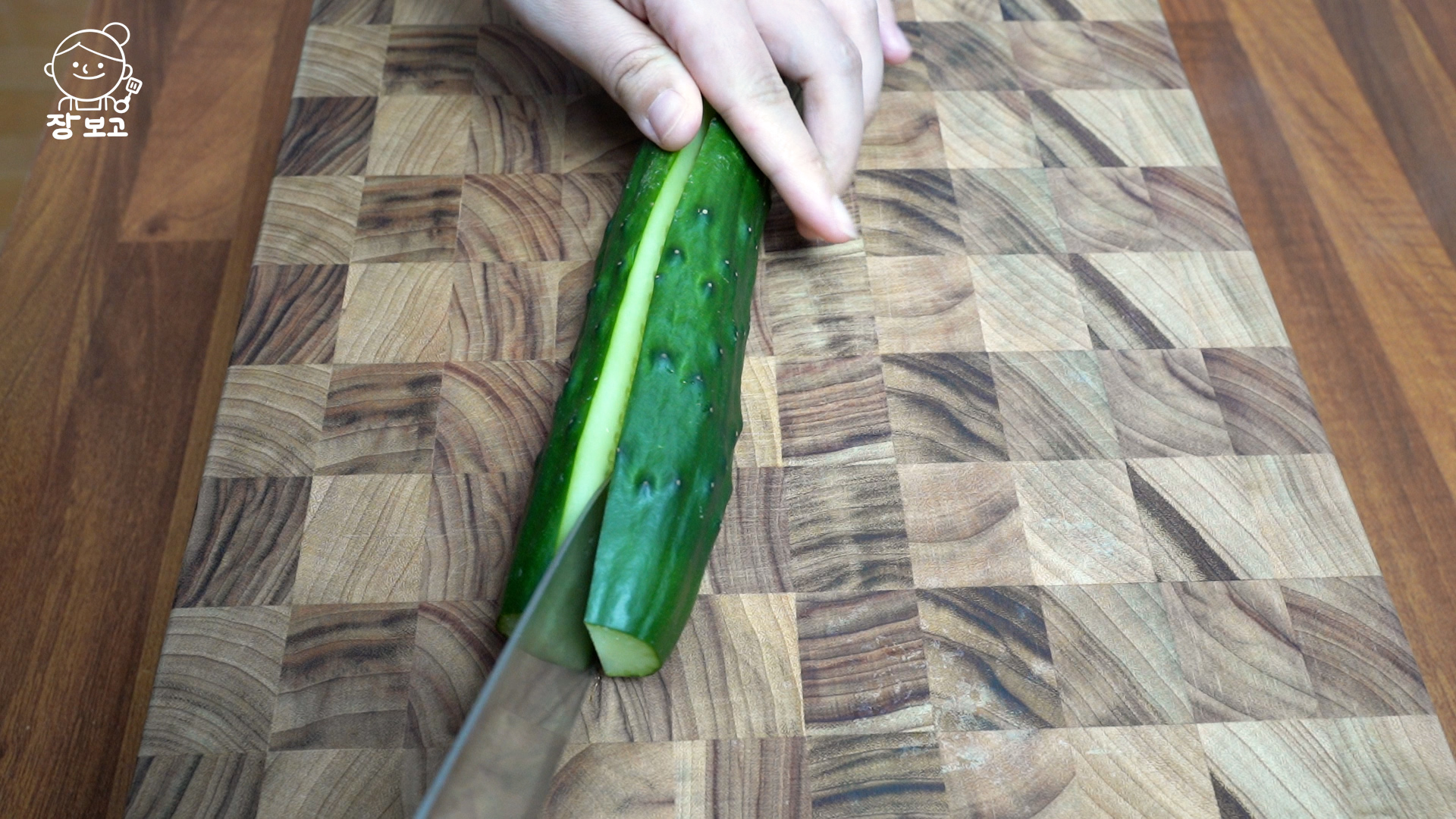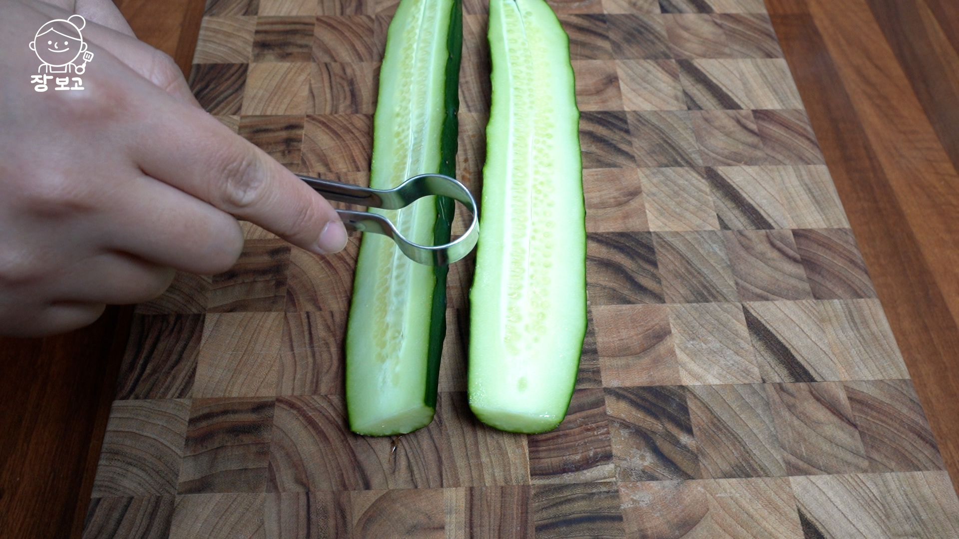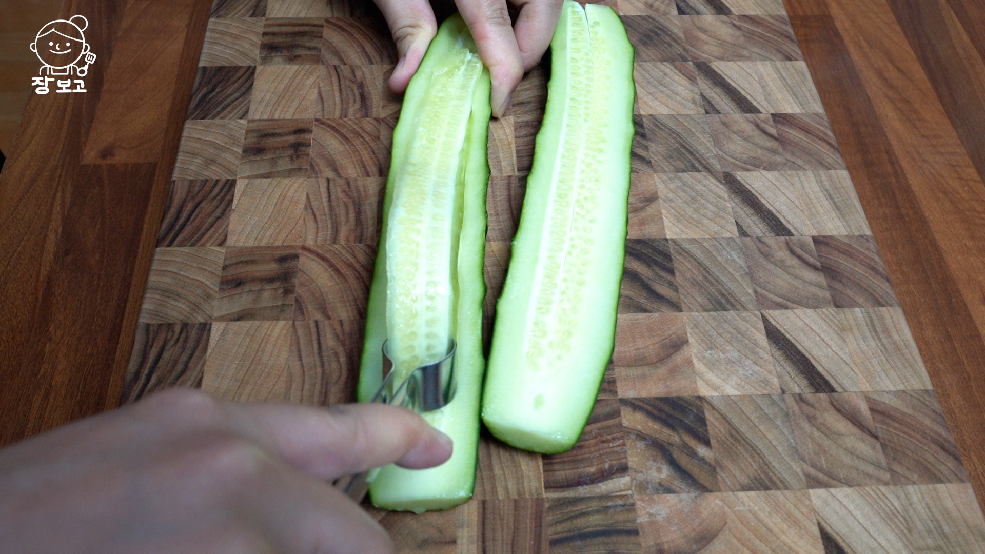 1. 취청 오이 3개는 깨끗이 씻어 준비한다. 쓴맛 나는 꼭지는 제거하고 길게 반으로 썰고 집게 뒷면을 이용해 물컹한 오이 속을 제거한다. 오이 속을 파낸 뒤 어슷 썬다.